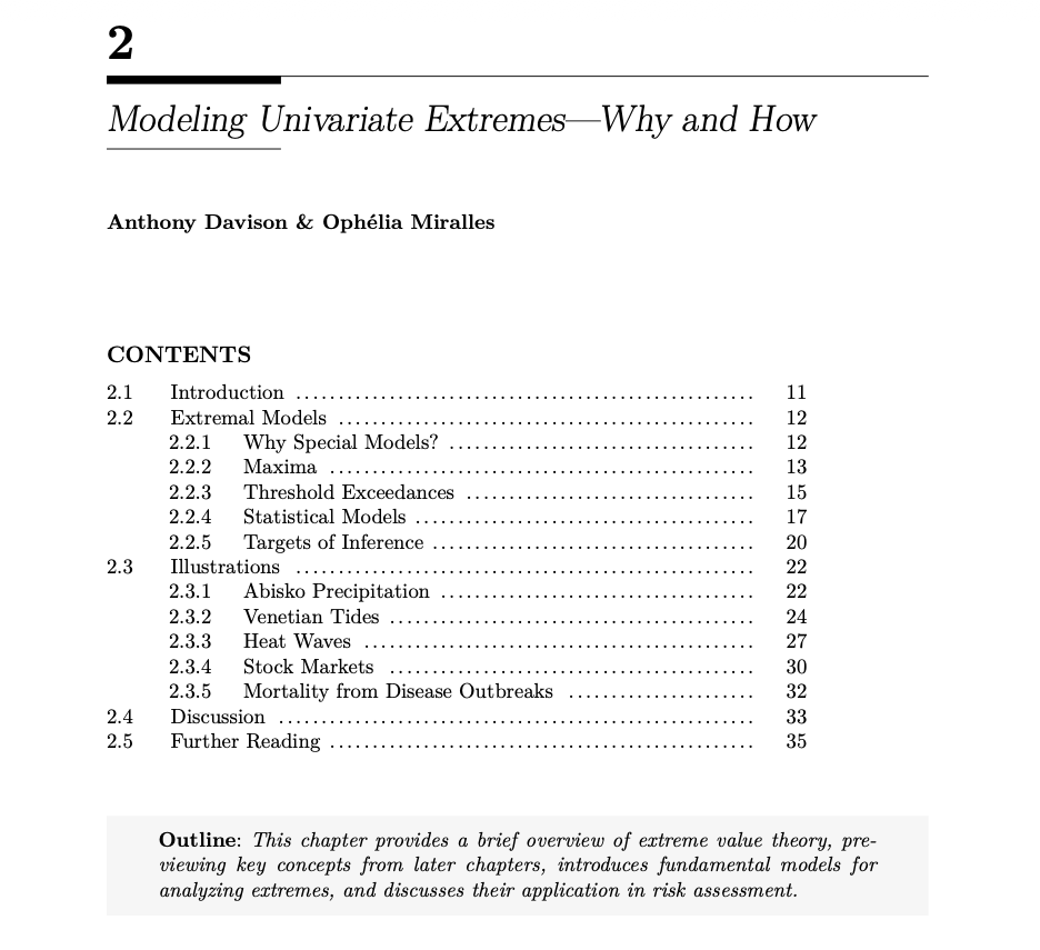 An indicator of the field’s vitality is the Springer journal Extremes, which regularly publishes novel methodological developments across all areas of extreme value statistics. While a range of other outlets feature work on the statistical modeling of extreme events, Extremes is widely regarded as the leading journal within the extreme value theory community. Many of the central developments presented in the Handbook have been published in Extremes or in other leading journals in the field.